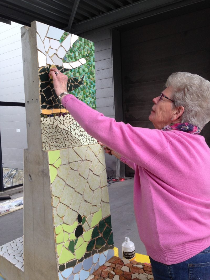 Marchien heeft vandaag het ijskristal (de ijsbloem) afgemaakt! Bovenkant en alle zijden zijn prachtig gemozaiekt; een prestatie van iemand die op de Vrijwilligersdag van de gemeente Tynaarl haar 1e mozaieksteentje heeft gelegd!