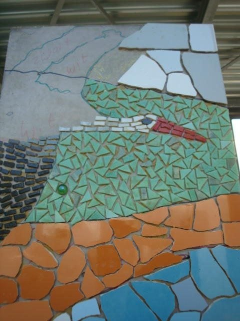 DE LAATSTE STEENTJES Gerda Boersema en Marchien Weering hebben behalve zaterdag ook in de weekdagen in vrije en late uren hard gewerkt aan de bank, waardoor er al veel klaar is; de luchten, de oevers en enkele restpunten. Vandaag verder met het water, het ijskristal en het afwerken. Nog een paar dagen hard werken en schoonmaken, dan kan er gevoegd worden.